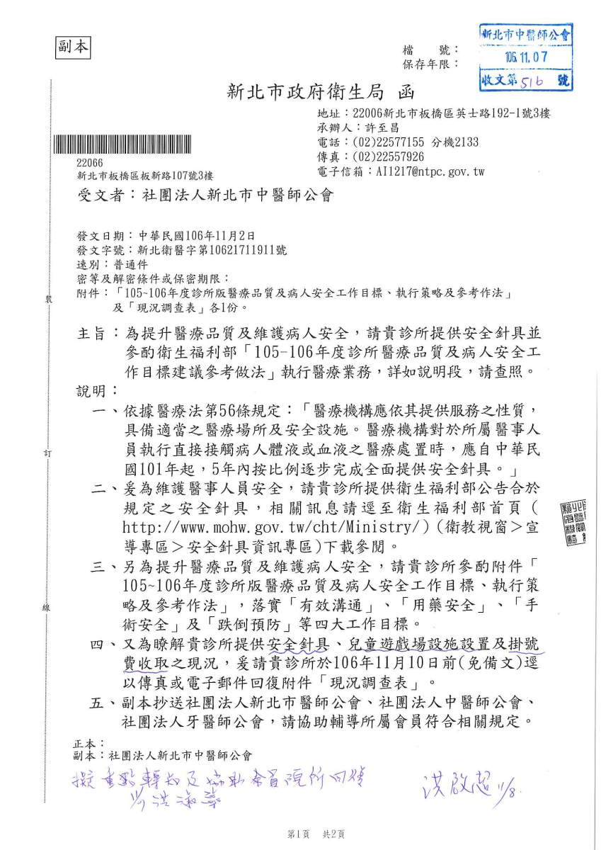 請診所提供安全針具並參酌衛生福利部"105-106年度診所醫療品質及病人安全工作目標建議參考做法"執行醫療業務